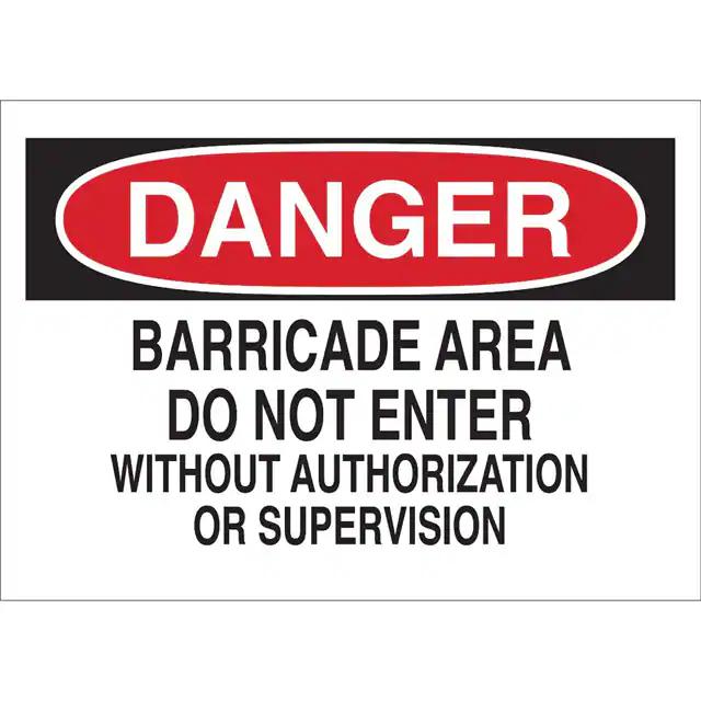 This is manufactured by Brady Corporation. The manufacturer part number is 70852. Label with a size of 20.00" l x 14.00" w (508.0mm x 355.6mm). The product is rohs3 compliant. It is assigned with possible HTSUS value of 3926.90.9985. It is shipped in bulk. It has a classic black and red legend, white background colour. The product brady®, is a highly preferred choice for users. The product is made from highly stable and reliable fiberglass. In addition, it is reach unaffected. Its typical moisture sensitivity level is not applicable. A bespoke label is a danger. barricade area do not enter without authorization or supervision label. The product is suitable for use with danger. It has a long 4 weeks standard lead time. The product is designated with the ear99 code number