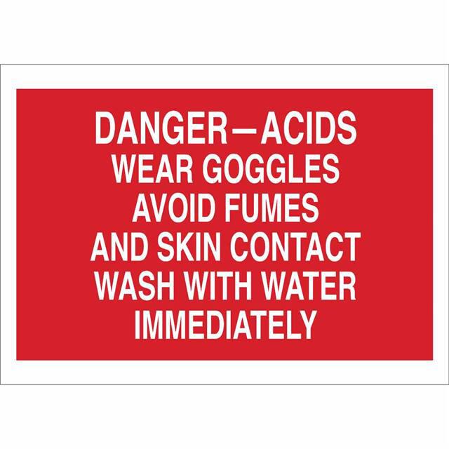 This is manufactured by Brady Corporation. The manufacturer part number is 73490. Label with a size of 14.00" l x 10.00" w (355.6mm x 254.0mm). The product is rohs3 compliant. It is assigned with possible HTSUS value of 3926.90.9985. It is shipped in bulk. It has a classic white legend, red background colour. The product brady®, is a highly preferred choice for users. The product is made from highly stable and reliable fiberglass. In addition, it is reach unaffected. Its typical moisture sensitivity level is not applicable. A bespoke label is a danger-acids. wear goggles avoid fumes and skin contact wash with water immediately label. The product is suitable for use with danger. It has a long 4 weeks standard lead time. The product is designated with the ear99 code number