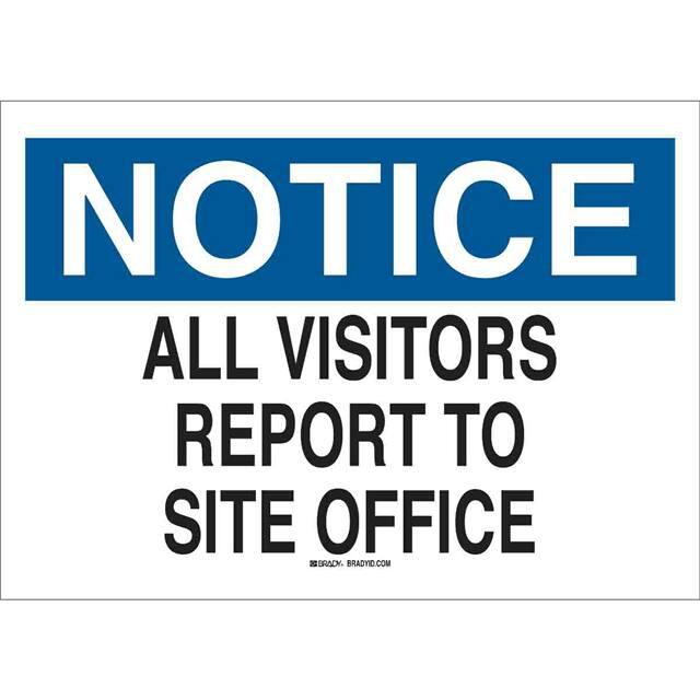This is manufactured by Brady Corporation. The manufacturer part number is 78018. Label with a size of 24.00" l x 18.00" w (609.6mm x 457.2mm). The product is rohs3 compliant. It is assigned with possible HTSUS value of 3926.90.9985. It is shipped in bulk. It has a classic black and blue legend, white background colour. The product brady®, is a highly preferred choice for users. The product is made from highly stable and reliable polypropylene. In addition, it is reach unaffected. Its typical moisture sensitivity level is not applicable. A bespoke label is a notice. all visitors report to site office label. The product is suitable for use with notice. It has a long 4 weeks standard lead time. The product is designated with the ear99 code number
