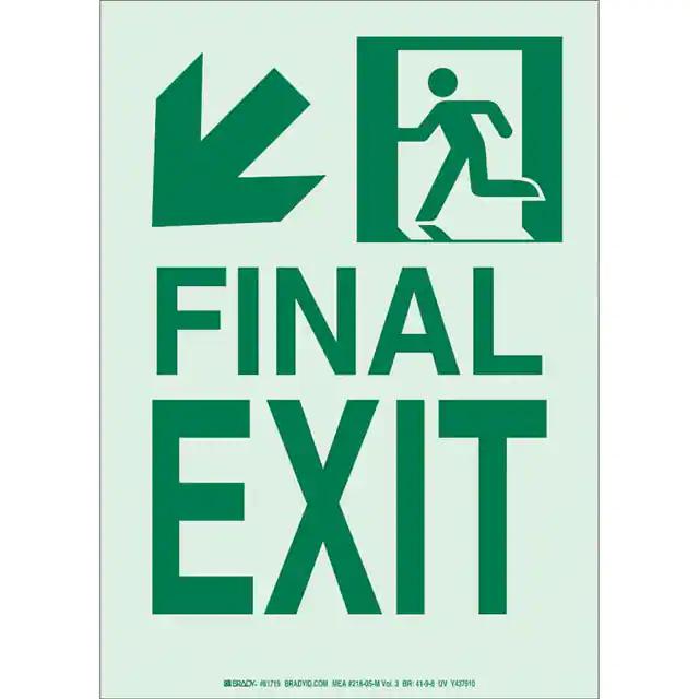 This is manufactured by Brady Corporation. The manufacturer part number is 81723. Label with a size of 14.00" l x 10.00" w (355.6mm x 254.0mm). The product is rohs3 compliant. It is assigned with possible HTSUS value of 8310.00.0000. It is shipped in bulk. It has a classic green legend, glow background colour. The product brady®, is a highly preferred choice for users. The product is made from highly stable and reliable aluminum. In addition, it is reach unaffected. Its typical moisture sensitivity level is not applicable. A bespoke label is a final exit label. The product is suitable for use with notice. It has a long 4 weeks standard lead time. The product is designated with the ear99 code number
