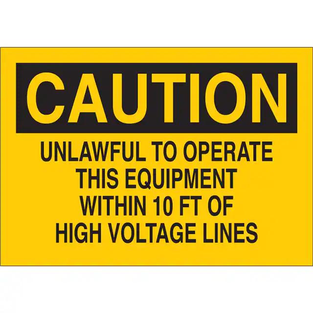 This is manufactured by Brady Corporation. The manufacturer part number is 84856. Label with a size of 14.00" l x 10.00" w (355.6mm x 254.0mm). The product is not applicable. It is assigned with possible HTSUS value of 3926.90.9985. It is shipped in bulk. It has a classic black legend, yellow background colour. The product brady®, is a highly preferred choice for users. The product is made from highly stable and reliable polyester. In addition, it is reach unaffected. Its typical moisture sensitivity level is not applicable. A bespoke label is a caution. unlawful to operate this equipment within 10 ft of high voltage lines label. The product is suitable for use with caution. It has a long 4 weeks standard lead time. The product is designated with the ear99 code number