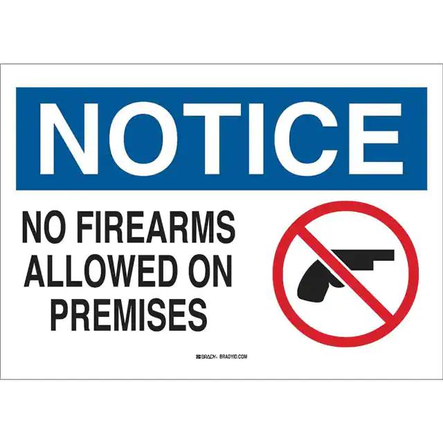 This is manufactured by Brady Corporation. The manufacturer part number is 84908. Label with a size of 14.00" l x 10.00" w (355.6mm x 254.0mm). The product is rohs3 compliant. It is assigned with possible HTSUS value of 3926.90.9985. It is shipped in bulk. It has a classic black, blue and red legend, white background colour. The product brady®, is a highly preferred choice for users. The product is made from highly stable and reliable polyester. In addition, it is reach unaffected. Its typical moisture sensitivity level is not applicable. A bespoke label is a notice. no firearms allowed on premises label. The product is suitable for use with notice. It has a long 4 weeks standard lead time. The product is designated with the ear99 code number