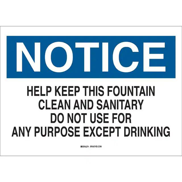 This is manufactured by Brady Corporation. The manufacturer part number is 85629. Label with a size of 14.00" l x 10.00" w (355.6mm x 254.0mm). The product is rohs3 compliant. It is assigned with possible HTSUS value of 3926.90.9985. It is shipped in bulk. It has a classic black and blue legend, white background colour. The product brady®, is a highly preferred choice for users. The product is made from highly stable and reliable polyester. In addition, it is reach unaffected. Its typical moisture sensitivity level is not applicable. A bespoke label is a notice. help keep this fountain clean and sanitary do not use for any purpose except drinking label. The product is suitable for use with notice. It has a long 4 weeks standard lead time. The product is designated with the ear99 code number