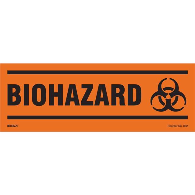 This is manufactured by Brady Corporation. The manufacturer part number is 862MLS. Label with a size of 10.00" l x 3.50" w (254.0mm x 88.9mm). The product is rohs3 compliant. It is assigned with possible HTSUS value of 3926.90.9985. It is shipped in bulk. It has a classic black legend, orange background colour. The product brady®, is a highly preferred choice for users. The product is made from highly stable and reliable vinyl. In addition, it is reach unaffected. Its typical moisture sensitivity level is not applicable. A bespoke label is a biohazard label. The product is suitable for use with warning. It has a long 4 weeks standard lead time. The product is designated with the ear99 code number