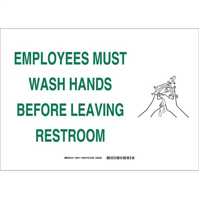 This is manufactured by Brady Corporation. The manufacturer part number is 87732. Label with a size of 14.00" l x 10.00" w (355.6mm x 254.0mm). The product is rohs3 compliant. It is assigned with possible HTSUS value of 3926.90.9985. It is shipped in bulk. It has a classic black and green legend, white background colour. The product brady®, is a highly preferred choice for users. The product is made from highly stable and reliable fiberglass. In addition, it is reach unaffected. Its typical moisture sensitivity level is not applicable. A bespoke label is a employees must wash hands before leaving restroom label. The product is suitable for use with warning. It has a long 4 weeks standard lead time. The product is designated with the ear99 code number
