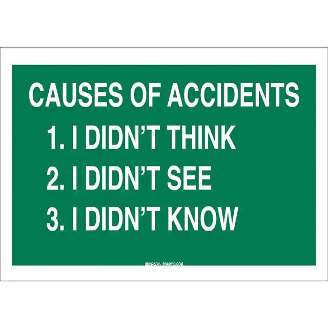 This is manufactured by Brady Corporation. The manufacturer part number is 88899. Label with a size of 14.00" l x 10.00" w (355.6mm x 254.0mm). The product is rohs3 compliant. It is assigned with possible HTSUS value of 3926.90.9985. It is shipped in bulk. It has a classic white legend, green background colour. The product brady®, is a highly preferred choice for users. The product is made from highly stable and reliable polyester. In addition, it is reach unaffected. Its typical moisture sensitivity level is not applicable. A bespoke label is a causes of accidents 1. i didn't think 2. i didn't see 3. i didn't know label. The product is suitable for use with warning. It has a long 4 weeks standard lead time. The product is designated with the ear99 code number