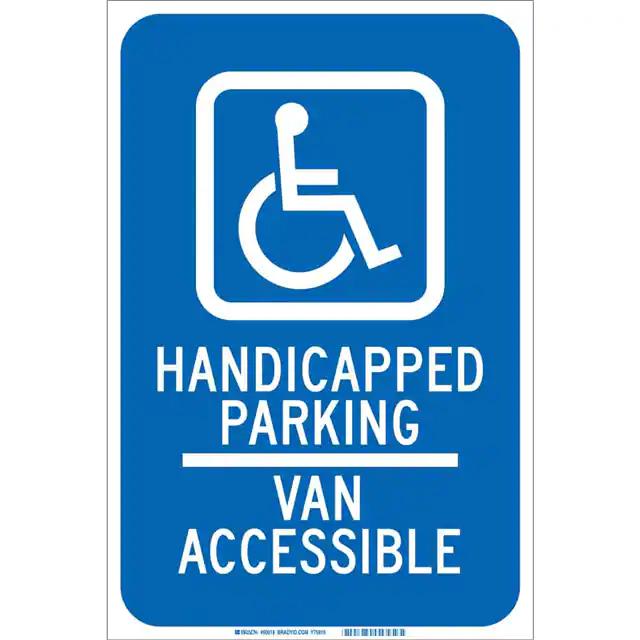 This is manufactured by Brady Corporation. The manufacturer part number is 90018. Label with a size of 18.00" l x 12.00" w (457.2mm x 304.8mm). The product is rohs3 compliant. It is assigned with possible HTSUS value of 8310.00.0000. It is shipped in bulk. It has a classic white legend, blue background colour. The product brady®, is a highly preferred choice for users. The product is made from highly stable and reliable aluminum. In addition, it is reach unaffected. Its typical moisture sensitivity level is not applicable. A bespoke label is a handicapped parking van accessible label. The product is suitable for use with warning. It has a long 4 weeks standard lead time. The product is designated with the ear99 code number