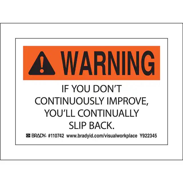 This is manufactured by Brady Corporation. The manufacturer part number is 110742. Label with a size of 5.00" l x 3.50" w (127.0mm x 88.9mm). The product is rohs3 compliant. It is assigned with possible HTSUS value of 3919.90.5060. It is shipped in bulk. It has a classic black and orange legend, white background colour. The product brady®, is a highly preferred choice for users. The product is made from highly stable and reliable polyester. In addition, it is reach unaffected. Its typical moisture sensitivity level is not applicable. A bespoke label is a warning. if you don't continuously improve, you'll continually slip back. label. The product is suitable for use with warning. It has a long 4 weeks standard lead time. The product is designated with the ear99 code number