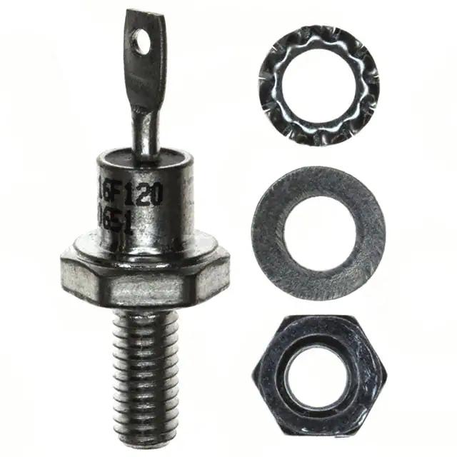This is manufactured by Vishay General Semiconductor - Diodes Division. The manufacturer part number is VS-16F120. It is assigned with possible HTSUS value of 8541.10.0080. The product is rohs3 compliant. Moreover, the product comes in [Package/ Case]. The product operate at temperatures ranging from -65°c ~ 175°c. In addition, it is reach unaffected. It features a 16a of average rectified current. It has a robust speed of standard recovery >500ns, > 200ma (io). The product has a maximum forward voltage of 1.23 v @ 50 a. It is shipped in bulk. While it has maximum reverse voltage of 1200 v. Its typical moisture sensitivity level is 1 (unlimited). It has a long 34 weeks standard lead time. 12 ma @ 1200 v is the reverse leakage value of a bespoke product. The product is available in chassis, stud mount configuration. do-203aa (do-4) is the supplier device package value. This product use standard technology. Moreover, it corresponds to 16f120, a base product number of the product. The product is designated with the ear99 code number