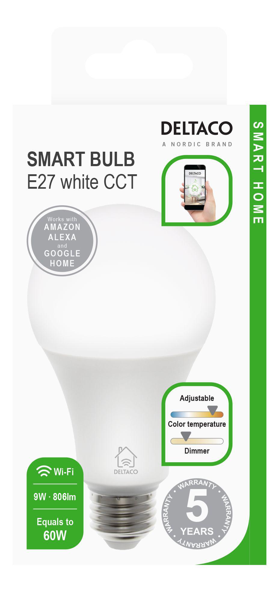 This is 9 W E27 Smart LED Lamp Smart Bulb White manufactured by Deltaco. The manufacturer part number is SH-LE27CCTC. Moreover, the product has a nominal 220 → 240 v voltage rating. It is a type of smart led lamp lamp.