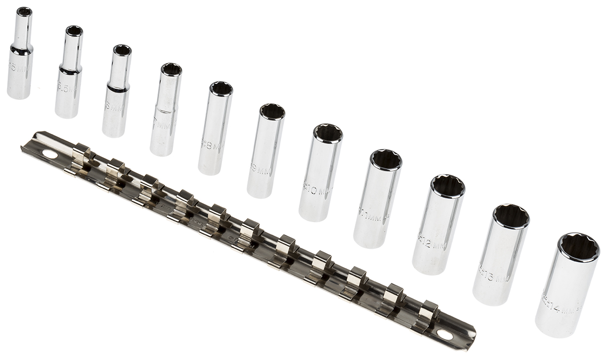 This is 11 Pieces Deep Socket Set 1/4 in Square Drive manufactured by Stanley. The manufacturer part number is 47203. A quality product with a nice chrome finish. The product features a square drive. The product is made from highly stable and reliable alloy steel. The product has a drive size of 1/4 in.