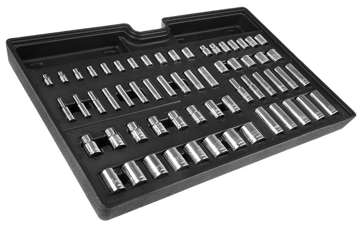 This is 61 Pieces Square Drive Socket Set 1/2 in 1/4 in 3/8 in Square Drive manufactured by RS Pro. The manufacturer part number is 480-6880. A quality product with a nice chrome finish. The product features a square drive. The product is made from highly stable and reliable chrome vanadium steel. The product has a drive size of 1/2 in, 1/4 in, 3/8 in.