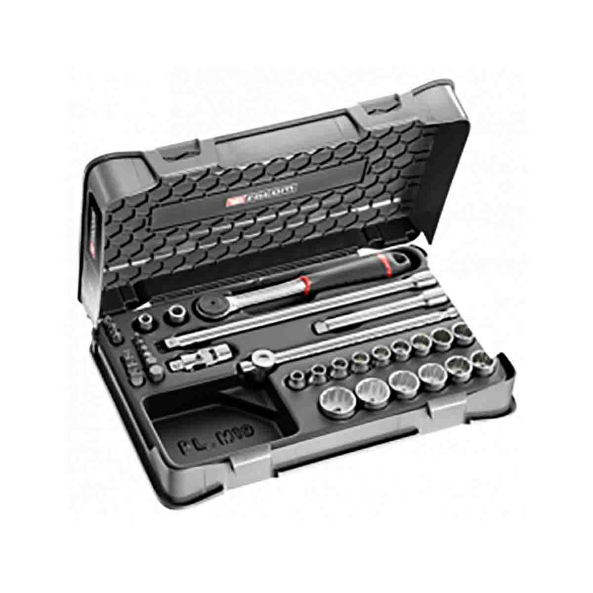 This is 3/8' SOCKET SET 12PT MM J.161B 35PC manufactured by Facom. The manufacturer part number is J.430BSP. The product features a square drive. The product has a drive size of 3/8 in.