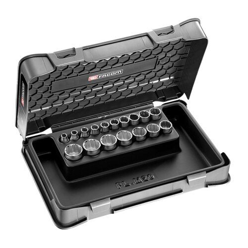 This is 17 Piece 3/8 in Socket Set manufactured by Facom. The manufacturer part number is J.400. The product has a drive size of 3/8 in. The product features a square drive.