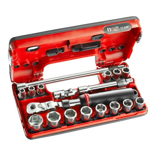 This is 18 Piece 3/8 in Socket Set manufactured by Facom. The manufacturer part number is JXL.DBOX1. The product has a drive size of 3/8 in. The product features a square drive.