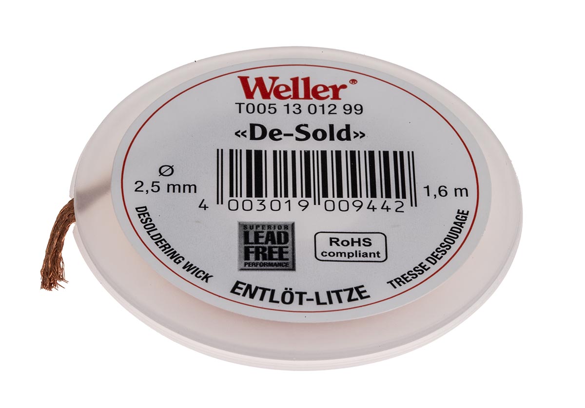 This is 1.6m Desoldering Braid Width 2.5mm manufactured by Weller. The manufacturer part number is T0051301299. Furthermore, the product is 2.5mm wide. Its accurate length is 1.6m.