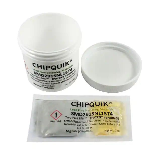 This is manufactured by Chip Quik Inc.. The manufacturer part number is SMD291SNL15T4. It is assigned with possible HTSUS value of 3810.10.0000. The product is rohs3 compliant. The product is highly reliable with a long-lasting period of 24 months. It comes in solder paste, two part mix configuration. It is composed of sn96.5ag3cu0.5 (96.5/3/0.5). The product is designed as a nice jar, 0.53 oz (15g). In addition, it is reach unaffected. Its warranty starts from date of manufacture. It offers storage features at 37°f ~ 77°f (3°c ~ 25°c). It is shipped in jar. Its typical moisture sensitivity level is not applicable. It has a long 4 weeks standard lead time. Moreover, it corresponds to smd291, a base product number of the product. The product is designated with the ear99 code number