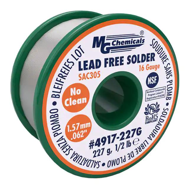 This is manufactured by MG Chemicals. The manufacturer part number is 4917-227G. It is assigned with possible HTSUS value of 8311.30.6000. The product is rohs3 compliant. It comes in wire solder configuration. It is composed of sn96.5ag3cu0.5 (96.5/3/0.5). The product is designed as a nice spool, 8 oz (227g), 1/2 lb. In addition, it is reach unaffected. It offers storage features at 65°f ~ 80°f (18°c ~ 27°c). It is shipped in spool. Moreover, the product has a wire gauge of 14 awg, 16 swg. Its typical moisture sensitivity level is not applicable. Its diameter is 0.062" (1.57mm). The product 4917, is a highly preferred choice for users. The product is designated with the ear99 code number