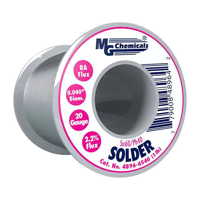 This is manufactured by MG Chemicals. The manufacturer part number is 4896-454G. It is assigned with possible HTSUS value of 8311.30.3000. The product is rohs non-compliant. The product is highly reliable with a long-lasting period of 60 months. It comes in wire solder configuration. It is composed of sn60pb40 (60/40). The product is designed as a nice spool, 1 lb (454 g). In addition, it is reach affected. It is shipped in spool. Moreover, the product has a wire gauge of 18 awg, 19 swg. Its typical moisture sensitivity level is not applicable. Its diameter is 0.040" (1.02mm). The typical product's weight is 1 lb (453.59 g). The product 4890, is a highly preferred choice for users. Moreover, it corresponds to 4896, a base product number of the product. The product is designated with the ear99 code number