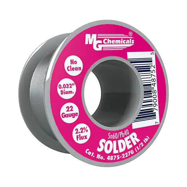 This is manufactured by MG Chemicals. The manufacturer part number is 4875-227G. It is assigned with possible HTSUS value of 8311.30.3000. The product is rohs non-compliant. The product is highly reliable with a long-lasting period of 60 months. It comes in wire solder configuration. It is composed of sn60pb40 (60/40). The product is designed as a nice spool, 8 oz (227g), 1/2 lb. In addition, it is reach affected. It is shipped in spool. Moreover, the product has a wire gauge of 20 awg, 21 swg. Its typical moisture sensitivity level is not applicable. It has a long 2 weeks standard lead time. Its diameter is 0.032" (0.81mm). The typical product's weight is 0.5 lb (226.8 g). The product 4870, is a highly preferred choice for users. Moreover, it corresponds to 4875, a base product number of the product. The product is designated with the ear99 code number