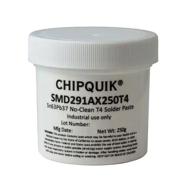 This is manufactured by Chip Quik Inc.. The manufacturer part number is SMD291AX250T4. It is assigned with possible HTSUS value of 3810.10.0000. The product is rohs3 compliant. The product is highly reliable with a long-lasting period of 12 months. It comes in solder paste configuration. It is composed of sn63pb37 (63/37). The product is designed as a nice jar, 8.8 oz (250g). In addition, it is reach unaffected. Its warranty starts from date of manufacture. It offers storage features at 37°f ~ 46°f (3°c ~ 8°c). It is shipped in jar. Its typical moisture sensitivity level is not applicable. It has a long 3 weeks standard lead time. Shipping Information: ships with cold pack. to ensure customer satisfaction and product integrity, air shipment is recommended.. Moreover, it corresponds to smd291, a base product number of the product. The product is designated with the ear99 code number