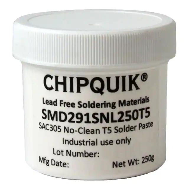 This is manufactured by Chip Quik Inc.. The manufacturer part number is SMD291SNL250T5. It is assigned with possible HTSUS value of 8311.30.6000. The product is rohs3 compliant. The product is highly reliable with a long-lasting period of 6 months. It comes in solder paste configuration. It is composed of sn96.5ag3cu0.5 (96.5/3/0.5). The product is designed as a nice jar, 8.8 oz (250g). In addition, it is reach unaffected. Its warranty starts from date of manufacture. It offers storage features at 37°f ~ 46°f (3°c ~ 8°c). It is shipped in jar. Its typical moisture sensitivity level is not applicable. It has a long 3 weeks standard lead time. Shipping Information: ships with cold pack. to ensure customer satisfaction and product integrity, air shipment is recommended.. The typical product's weight is 0.551 lb (249.93 g). Moreover, it corresponds to smd291, a base product number of the product. The product is designated with the ear99 code number