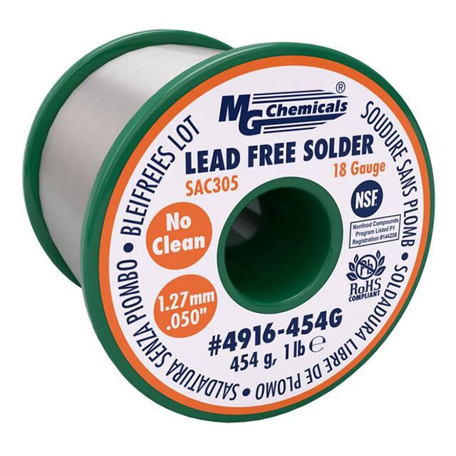 This is manufactured by MG Chemicals. The manufacturer part number is 4916-454G. It is assigned with possible HTSUS value of 8311.30.6000. The product is rohs3 compliant. It comes in wire solder configuration. It is composed of sn96.5ag3cu0.5 (96.5/3/0.5). The product is designed as a nice spool, 1 lb (454 g). In addition, it is reach unaffected. It offers storage features at 65°f ~ 80°f (18°c ~ 27°c). It is shipped in spool. Moreover, the product has a wire gauge of 16 awg, 18 swg. Its typical moisture sensitivity level is not applicable. Its diameter is 0.050" (1.27mm). The product 4916, is a highly preferred choice for users. The product is designated with the ear99 code number