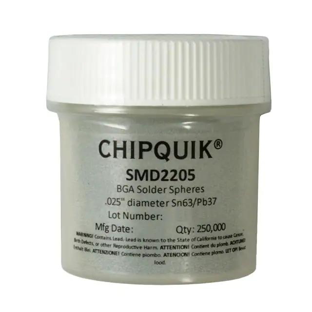 This is manufactured by Chip Quik Inc.. The manufacturer part number is SMD2205. It is assigned with possible HTSUS value of 8311.30.3000. The product is rohs non-compliant. The product is highly reliable with a long-lasting period of 24 months. It comes in solder sphere configuration. It is composed of sn63pb37 (63/37). The product is designed as a nice jar. In addition, it is reach unaffected. Its warranty starts from date of manufacture. It is shipped in bulk. Its typical moisture sensitivity level is not applicable. It has a long 3 weeks standard lead time. Its diameter is 0.025" (0.64mm). The product smd2, is a highly preferred choice for users. The product is designated with the ear99 code number