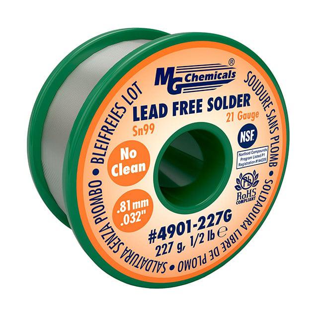 This is manufactured by MG Chemicals. The manufacturer part number is 4901-227G. It is assigned with possible HTSUS value of 8311.30.6000. The product is rohs3 compliant. The product is highly reliable with a long-lasting period of 60 months. It comes in wire solder configuration. It is composed of sn99.3cu0.7 (99.3/0.7). The product is designed as a nice spool, 8 oz (227g), 1/2 lb. In addition, it is reach unaffected. It offers storage features at 65°f ~ 80°f (18°c ~ 27°c). It is shipped in spool. Moreover, the product has a wire gauge of 20 awg, 21 swg. Its typical moisture sensitivity level is not applicable. It has a long 2 weeks standard lead time. Its diameter is 0.032" (0.81mm). The typical product's weight is 0.5 lb (226.8 g). The product 4901, is a highly preferred choice for users. Moreover, it corresponds to 4901, a base product number of the product. The product is designated with the ear99 code number