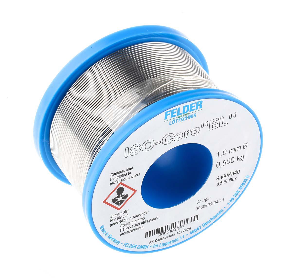 This is 1mm Wire Lead solder +183 → +190°C Melting Point 40% Lead 60% Tin 500g manufactured by Felder Lottechnik. The manufacturer part number is 20.601.03037.