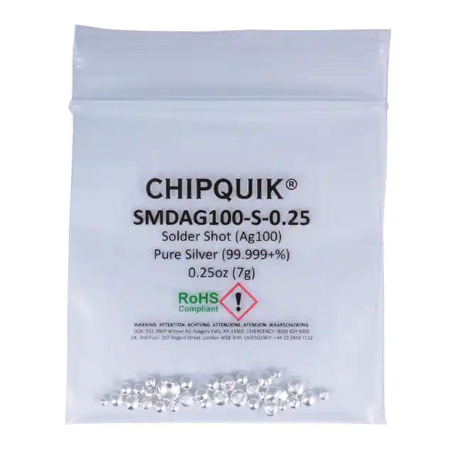 This is manufactured by Chip Quik Inc.. The manufacturer part number is SMDAG100-S-0.25. It is assigned with possible HTSUS value of 8311.90.0000. The product is rohs3 compliant. It comes in solder shot configuration. It is composed of ag100(100). The product is designed as a nice bag, 0.25 oz (7g). In addition, it is reach unaffected. It is shipped in bulk. Its typical moisture sensitivity level is not applicable. It has a long 4 weeks standard lead time. The product smd, is a highly preferred choice for users. Moreover, it corresponds to smdag, a base product number of the product. The product is designated with the ear99 code number