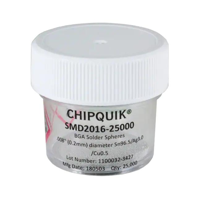 This is manufactured by Chip Quik Inc.. The manufacturer part number is SMD2016-25000. It is assigned with possible HTSUS value of 8311.90.0000. The product is rohs3 compliant. The product is highly reliable with a long-lasting period of 24 months. It comes in solder sphere configuration. It is composed of sn96.5ag3cu0.5 (96.5/3/0.5). The product is designed as a nice jar. In addition, it is reach unaffected. Its warranty starts from date of manufacture. It is shipped in bulk. Its typical moisture sensitivity level is not applicable. It has a long 3 weeks standard lead time. Its diameter is 0.008" (0.20mm). The product smd2, is a highly preferred choice for users. The product is designated with the ear99 code number