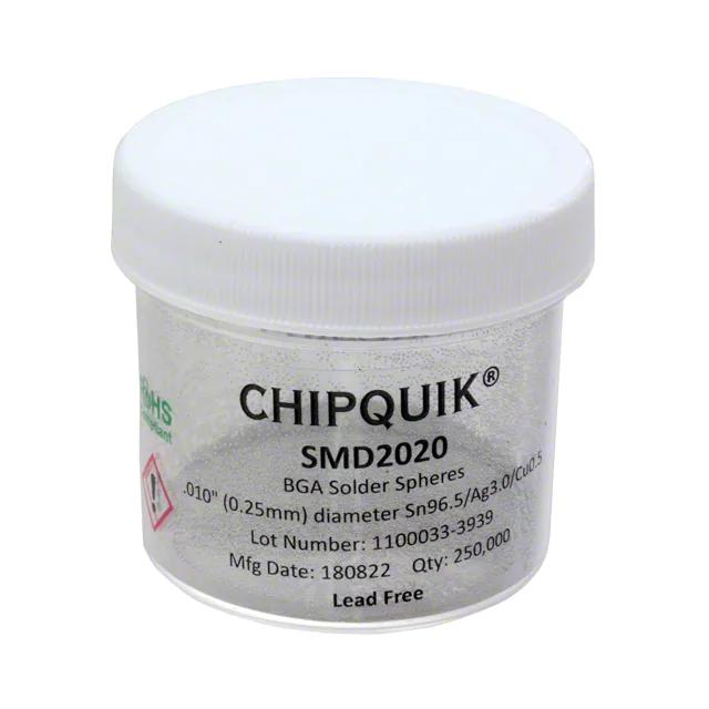 This is manufactured by Chip Quik Inc.. The manufacturer part number is SMD2020. It is assigned with possible HTSUS value of 8311.90.0000. The product is rohs3 compliant. The product is highly reliable with a long-lasting period of 24 months. It comes in solder sphere configuration. It is composed of sn96.5ag3cu0.5 (96.5/3/0.5). The product is designed as a nice jar. In addition, it is reach unaffected. Its warranty starts from date of manufacture. It is shipped in bulk. Its typical moisture sensitivity level is not applicable. It has a long 3 weeks standard lead time. Its diameter is 0.010" (0.25mm). The product smd2, is a highly preferred choice for users. The product is designated with the ear99 code number