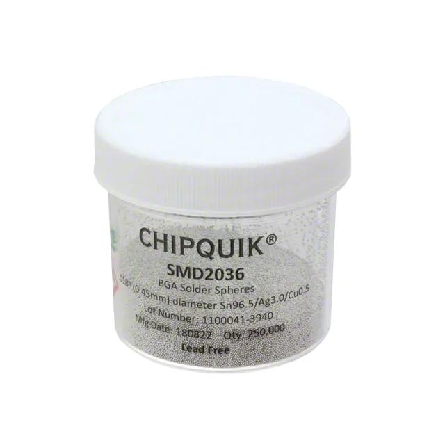 This is manufactured by Chip Quik Inc.. The manufacturer part number is SMD2036. It is assigned with possible HTSUS value of 8311.90.0000. The product is rohs3 compliant. The product is highly reliable with a long-lasting period of 24 months. It comes in solder sphere configuration. It is composed of sn96.5ag3cu0.5 (96.5/3/0.5). The product is designed as a nice jar. In addition, it is reach unaffected. Its warranty starts from date of manufacture. It is shipped in bulk. Its typical moisture sensitivity level is not applicable. It has a long 3 weeks standard lead time. Its diameter is 0.018" (0.46mm). The product smd2, is a highly preferred choice for users. The product is designated with the ear99 code number