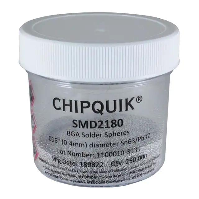 This is manufactured by Chip Quik Inc.. The manufacturer part number is SMD2180. It is assigned with possible HTSUS value of 8311.90.0000. The product is rohs non-compliant. The product is highly reliable with a long-lasting period of 24 months. It comes in solder sphere configuration. It is composed of sn63pb37 (63/37). The product is designed as a nice jar. In addition, it is reach affected. Its warranty starts from date of manufacture. It is shipped in bulk. Its typical moisture sensitivity level is not applicable. It has a long 3 weeks standard lead time. Its diameter is 0.016" (0.40mm). The product smd2, is a highly preferred choice for users. The product is designated with the ear99 code number