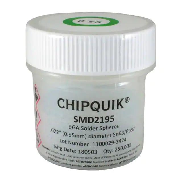 This is manufactured by Chip Quik Inc.. The manufacturer part number is SMD2195. It is assigned with possible HTSUS value of 8311.90.0000. The product is rohs non-compliant. The product is highly reliable with a long-lasting period of 24 months. It comes in solder sphere configuration. It is composed of sn63pb37 (63/37). The product is designed as a nice jar. In addition, it is reach affected. Its warranty starts from date of manufacture. It is shipped in bulk. Its typical moisture sensitivity level is not applicable. It has a long 3 weeks standard lead time. Its diameter is 0.022" (0.56mm). The product smd2, is a highly preferred choice for users. The product is designated with the ear99 code number