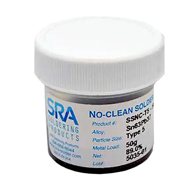 This is manufactured by SRA Soldering Products. The manufacturer part number is SSNC-T5-50G. It is assigned with possible HTSUS value of 3810.10.0000. The product is rohs non-compliant. The product is highly reliable with a long-lasting period of 12 months. It comes in solder paste configuration. It is composed of sn63pb37 (63/37). The product is designed as a nice jar, 1.76 oz (50g). In addition, it is reach unaffected. Its warranty starts from date of manufacture. It offers storage features at 37°f ~ 46°f (3°c ~ 8°c). It is shipped in bag. Its typical moisture sensitivity level is 1 (unlimited). It has a long 3 weeks standard lead time. Shipping Information: ships with cold pack. to ensure customer satisfaction and product integrity, air shipment is recommended.. Moreover, it corresponds to ssnc-t, a base product number of the product. The product is designated with the ear99 code number