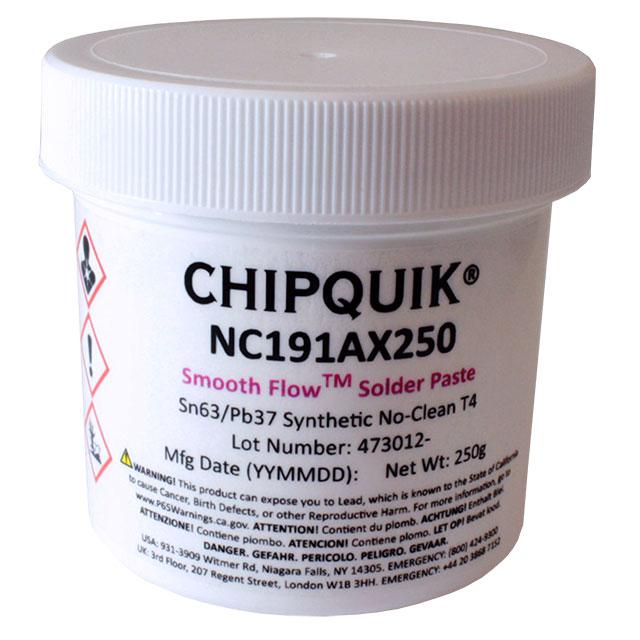 This is manufactured by Chip Quik Inc.. The manufacturer part number is NC191AX250. It is assigned with possible HTSUS value of 3810.10.0000. The product is rohs non-compliant. The product is highly reliable with a long-lasting period of 12 months. It comes in solder paste configuration. It is composed of sn63pb37 (63/37). The product is designed as a nice jar, 8.8 oz (250g). In addition, it is reach affected. Its warranty starts from date of manufacture. It offers storage features at 37°f ~ 46°f (3°c ~ 8°c). It is shipped in bulk. Its typical moisture sensitivity level is 1 (unlimited). It has a long 4 weeks standard lead time. The product smooth flow™, is a highly preferred choice for users. Moreover, it corresponds to nc191, a base product number of the product. The product is designated with the ear99 code number