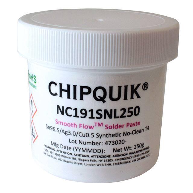 This is manufactured by Chip Quik Inc.. The manufacturer part number is NC191SNL250. It is assigned with possible HTSUS value of 3810.10.0000. The product is rohs3 compliant. The product is highly reliable with a long-lasting period of 6 months. It comes in solder paste configuration. It is composed of sn96.5ag3cu0.5 (96.5/3/0.5). The product is designed as a nice jar, 8.8 oz (250g). In addition, it is reach unaffected. Its warranty starts from date of manufacture. It offers storage features at 37°f ~ 46°f (3°c ~ 8°c). It is shipped in bulk. Its typical moisture sensitivity level is 1 (unlimited). It has a long 4 weeks standard lead time. The product smooth flow™, is a highly preferred choice for users. Moreover, it corresponds to nc191, a base product number of the product. The product is designated with the ear99 code number