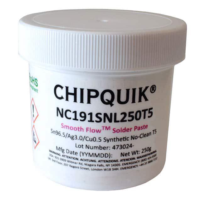 This is manufactured by Chip Quik Inc.. The manufacturer part number is NC191SNL250T5. It is assigned with possible HTSUS value of 3810.10.0000. The product is rohs3 compliant. The product is highly reliable with a long-lasting period of 6 months. It comes in solder paste configuration. It is composed of sn96.5ag3cu0.5 (96.5/3/0.5). The product is designed as a nice jar, 8.8 oz (250g). In addition, it is reach unaffected. Its warranty starts from date of manufacture. It offers storage features at 37°f ~ 46°f (3°c ~ 8°c). It is shipped in bulk. Its typical moisture sensitivity level is 1 (unlimited). It has a long 4 weeks standard lead time. The product smooth flow™, is a highly preferred choice for users. Moreover, it corresponds to nc191, a base product number of the product. The product is designated with the ear99 code number