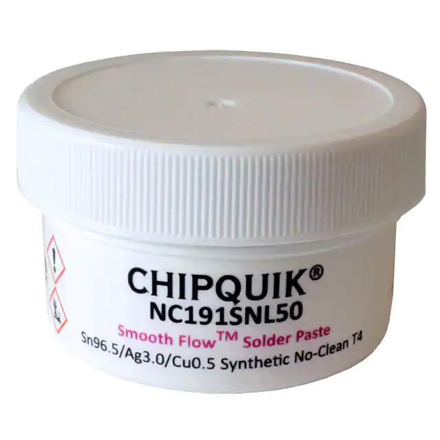 This is manufactured by Chip Quik Inc.. The manufacturer part number is NC191SNL50. It is assigned with possible HTSUS value of 3810.10.0000. The product is rohs3 compliant. The product is highly reliable with a long-lasting period of 6 months. It comes in solder paste configuration. It is composed of sn96.5ag3cu0.5 (96.5/3/0.5). The product is designed as a nice jar, 1.76 oz (50g). In addition, it is reach unaffected. Its warranty starts from date of manufacture. It offers storage features at 37°f ~ 46°f (3°c ~ 8°c). It is shipped in bulk. Its typical moisture sensitivity level is 1 (unlimited). It has a long 4 weeks standard lead time. The product smooth flow™, is a highly preferred choice for users. Moreover, it corresponds to nc191, a base product number of the product. The product is designated with the ear99 code number