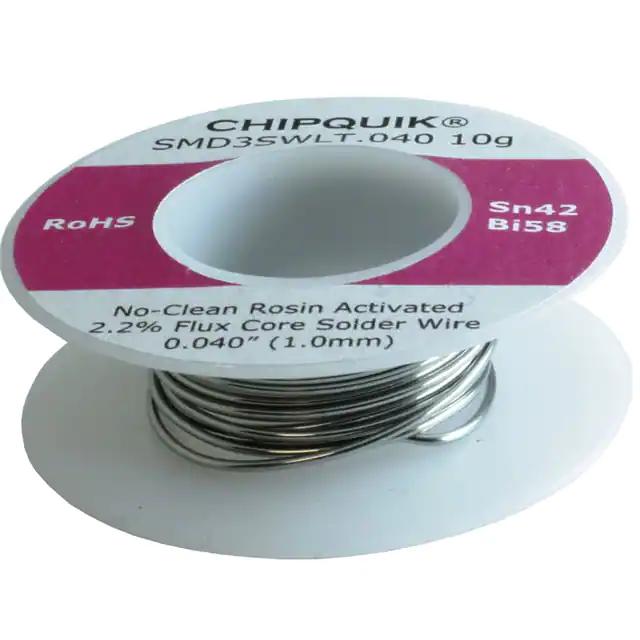 This is manufactured by Chip Quik Inc.. The manufacturer part number is SMD3SWLT.040 10G. It is assigned with possible HTSUS value of 8311.30.6000. The product is rohs3 compliant. It comes in wire solder configuration. It is composed of bi58sn42 (58/42). The product is designed as a nice spool, 0.35 oz (10g). In addition, it is reach unaffected. It is shipped in bulk. Its typical moisture sensitivity level is 1 (unlimited). It has a long 4 weeks standard lead time. Its diameter is 0.040" (1.02mm). The product smd3, is a highly preferred choice for users. Moreover, it corresponds to smd3s, a base product number of the product. The product is designated with the ear99 code number