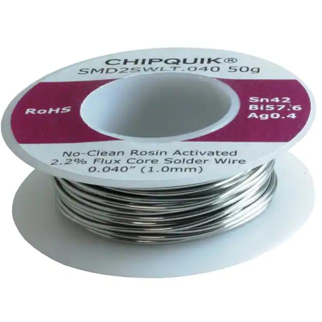 This is manufactured by Chip Quik Inc.. The manufacturer part number is SMD2SWLT.040 50G. It is assigned with possible HTSUS value of 8311.30.6000. The product is rohs3 compliant. It comes in wire solder configuration. It is composed of bi57.6sn42ag0.4 (57.6/42/0.4). The product is designed as a nice spool, 1.8 oz (50g). In addition, it is reach unaffected. It is shipped in bulk. Its typical moisture sensitivity level is 1 (unlimited). It has a long 4 weeks standard lead time. Its diameter is 0.040" (1.02mm). The product smd2, is a highly preferred choice for users. Moreover, it corresponds to smd2s, a base product number of the product. The product is designated with the ear99 code number