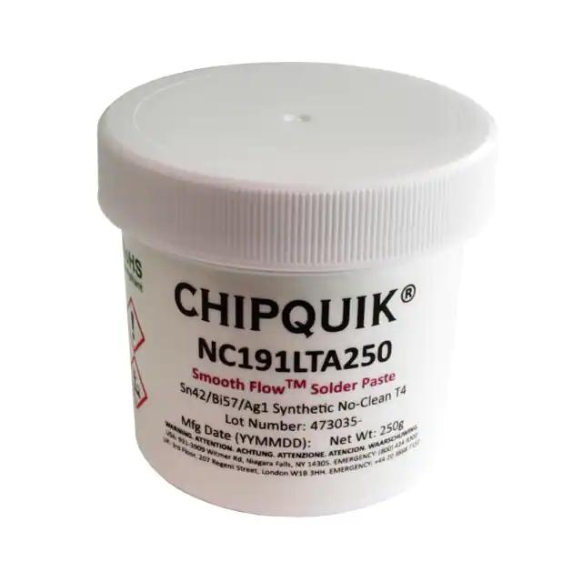 This is manufactured by Chip Quik Inc.. The manufacturer part number is NC191LTA250. It is assigned with possible HTSUS value of 3810.10.0000. The product is rohs3 compliant. The product is highly reliable with a long-lasting period of 12 months. It comes in solder paste configuration. It is composed of bi57sn42ag1 (57/42/1). The product is designed as a nice jar, 8.8 oz (250g). In addition, it is reach unaffected. Its warranty starts from date of manufacture. It offers storage features at 37°f ~ 46°f (3°c ~ 8°c). It is shipped in bulk. Its typical moisture sensitivity level is 1 (unlimited). It has a long 4 weeks standard lead time. The product smooth flow™, is a highly preferred choice for users. Moreover, it corresponds to nc191, a base product number of the product. The product is designated with the ear99 code number