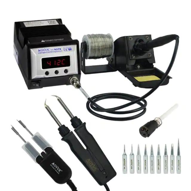 This is manufactured by SRA Soldering Products. The manufacturer part number is AO9378-TWZKIT. It is assigned with possible HTSUS value of 8515.19.0000. The product is rohs compliant. The possible product's input voltage is 110v. It comes in soldering configuration. In addition, it is reach unaffected. The product is also supplied with power cord. It is supplied with 2 channels. It is shipped in box. Its typical moisture sensitivity level is 1 (unlimited). It has a long 20 weeks standard lead time. The splendid features of the product include ceramic heater, temperature control. The product aoyue®, is a highly preferred choice for users. Furthermore, the output voltage is 24v. The product is designated with the ear99 code number