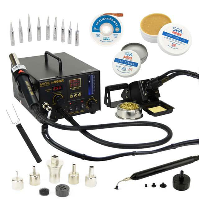 This is manufactured by SRA Soldering Products. The manufacturer part number is AO968A+220VKIT1. It is assigned with possible HTSUS value of 8515.19.0000. The product is rohs3 compliant. The possible product's input voltage is 220v. It comes in rework, soldering configuration. The product is also supplied with heating element, iron stand, micro tweezers, power cord, soldering iron, tips. It is supplied with 1 channels. The product's typical temperature range incudes 392°f ~ 896°f (200°c ~ 480°c). It is shipped in box. Its typical moisture sensitivity level is not applicable. It has a long 1 weeks standard lead time. The product aoyue®, is a highly preferred choice for users. Furthermore, the output voltage is 24v. The product is designated with the ear99 code number