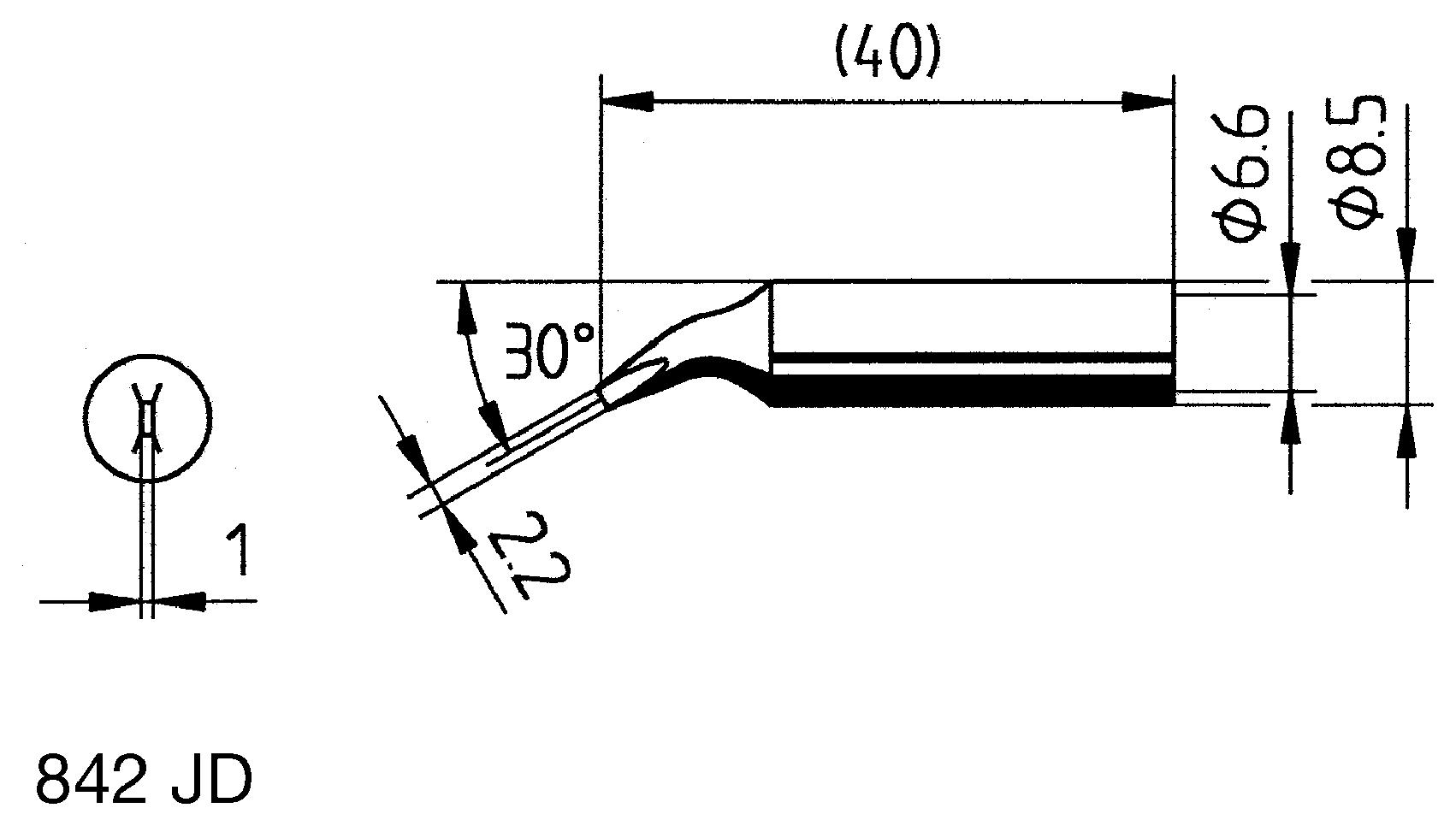 This is 2.2 mm 30° Bent Chisel Soldering Iron Tip manufactured by Ersa. The manufacturer part number is 0842JD.