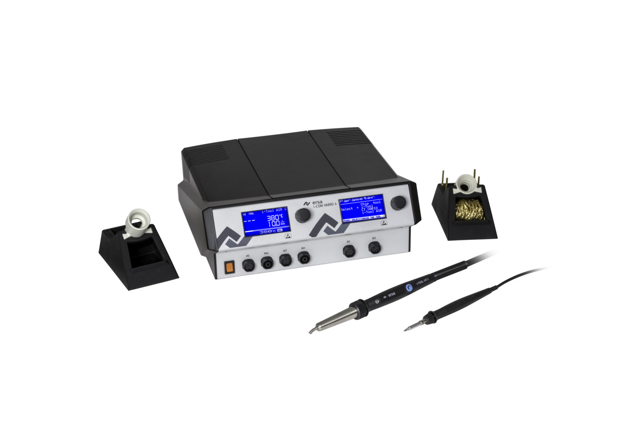 This is Soldering Station 360W 230V ac manufactured by Ersa. The manufacturer part number is 0ICV4000AI. Additionally, the product is supplied with 4 outputs. It features a remarkable lcd display. It has a maximum operating temperature of 450°c.