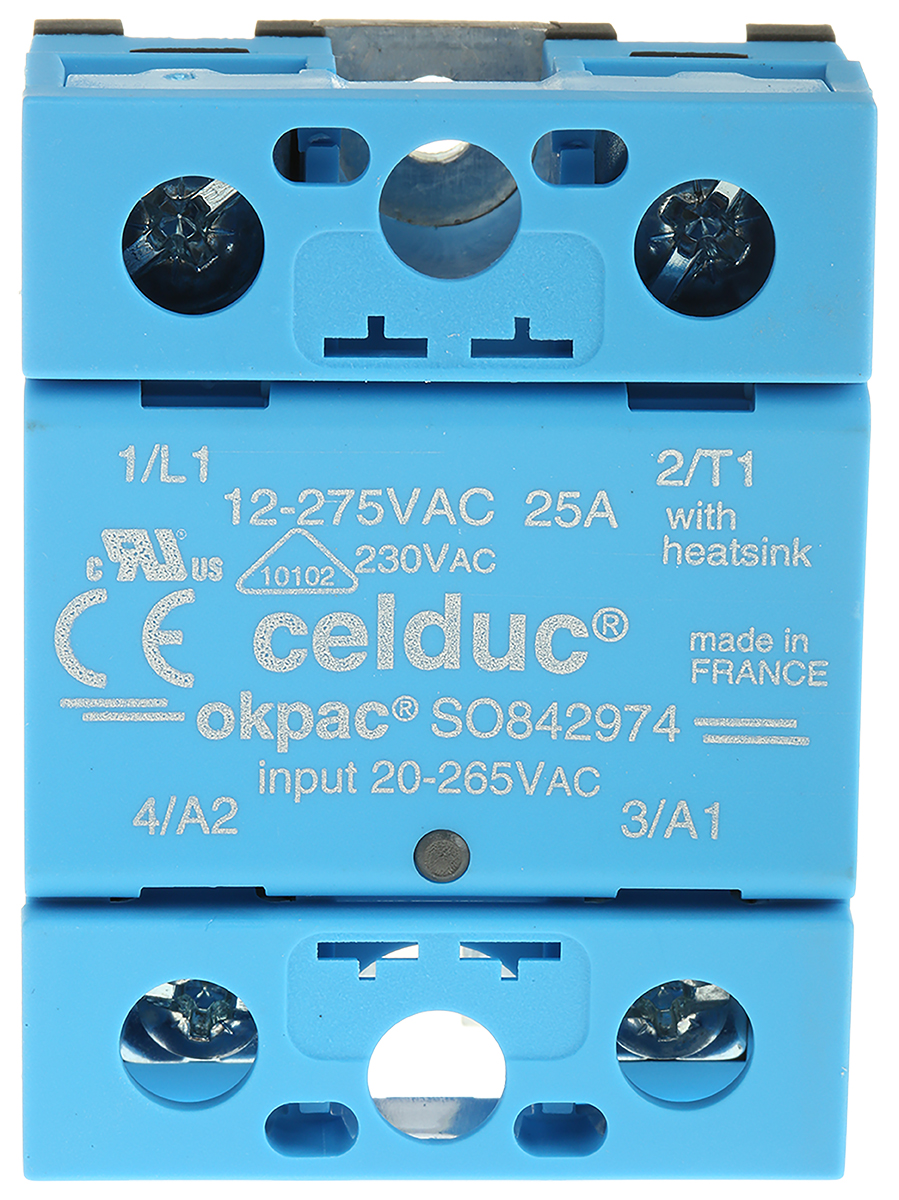 This is 25 A Solid State Relay Zero Crossing Chassis Mount Triac 275 V rms Maximum Load manufactured by Celduc. The manufacturer part number is SO842974. The given dimensions of the product include 58.5 x 45 x 30mm. This is basically a single phase solid state relay. It has a maximum operating temperature of +100°c. The terminal is a screw type. Its accurate length is 58.5mm. The product is available in panel mount configuration. The product so8, is a highly preferred choice for users. The product comes in 45mm depth. In addition, the height is 30mm. Whereas, the minimum operating temperature of the product is -55°c. It has equipped with 1 poles.