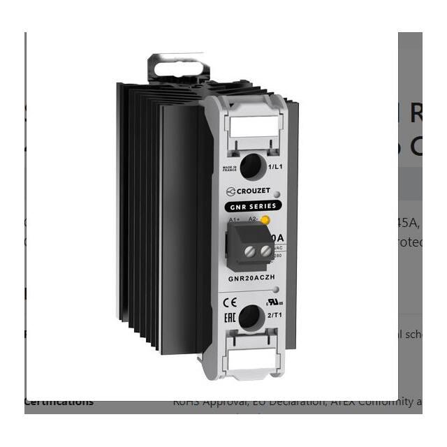 This is manufactured by Crouzet. The manufacturer part number is GNR45DCZP. The product is available in din rail configuration. The product gnr, is a highly preferred choice for users. It is assigned with possible HTSUS value of 8536.49.0080. The product is rohs compliant. Moreover, it has screw terminal terminal style. Moreover, the product comes in [Package/ Case]. The possible product's input voltage is 4 ~ 32vdc. It has a typical 32 a load current. In addition, it is reach unaffected. Furthermore, it has aac, zero cross output. It is shipped in box. Its typical moisture sensitivity level is 1 (unlimited). It has an integral spst-no (1 form a) circuit. It has a long 3 weeks standard lead time. The product is available in chassis mount, din rail configuration. The product gn+r, is a highly preferred choice for users. The given load voltage is 24 v ~ 500 v. module is the supplier device package value. Moreover, it corresponds to gnr45, a base product number of the product. The product is designated with the ear99 code number